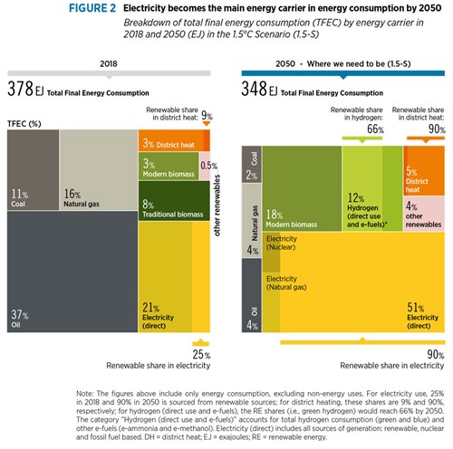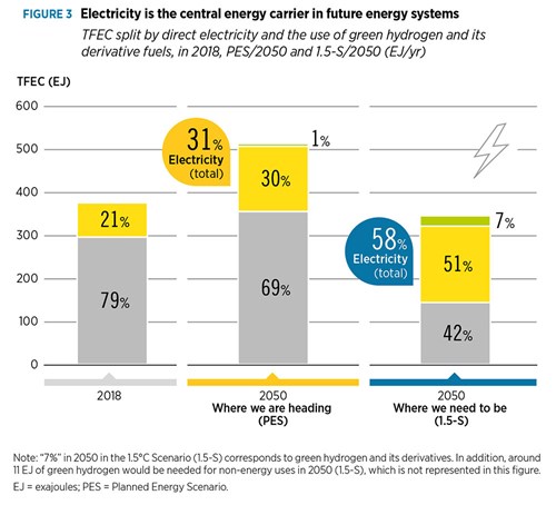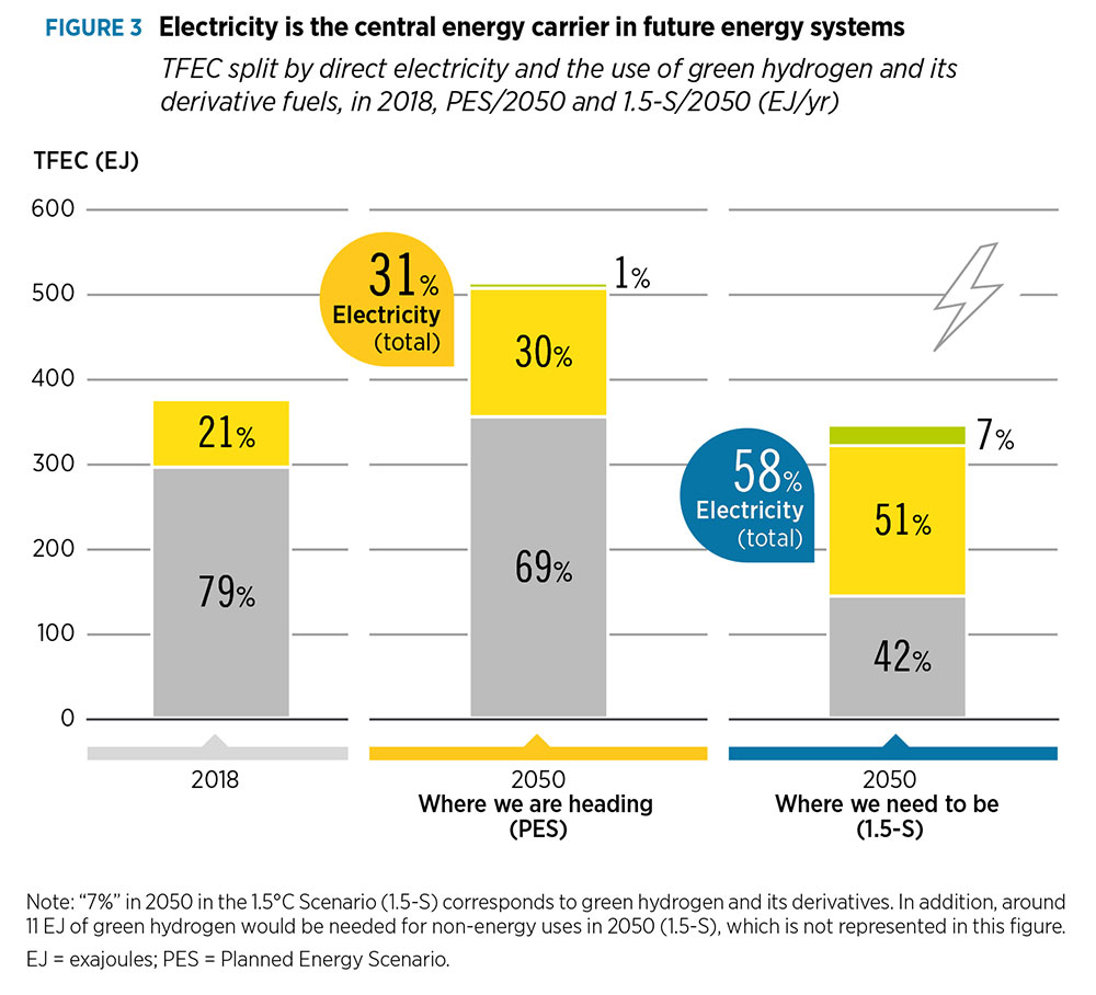It is important to note that hydrogen also indirectly contributes to electricity’s share of TFEC, given its role in electrifying modes of transportation through the use of fuel-cell technology and the use of e-fuels such as ammonia and methanol in power generation (see Fig. 3).