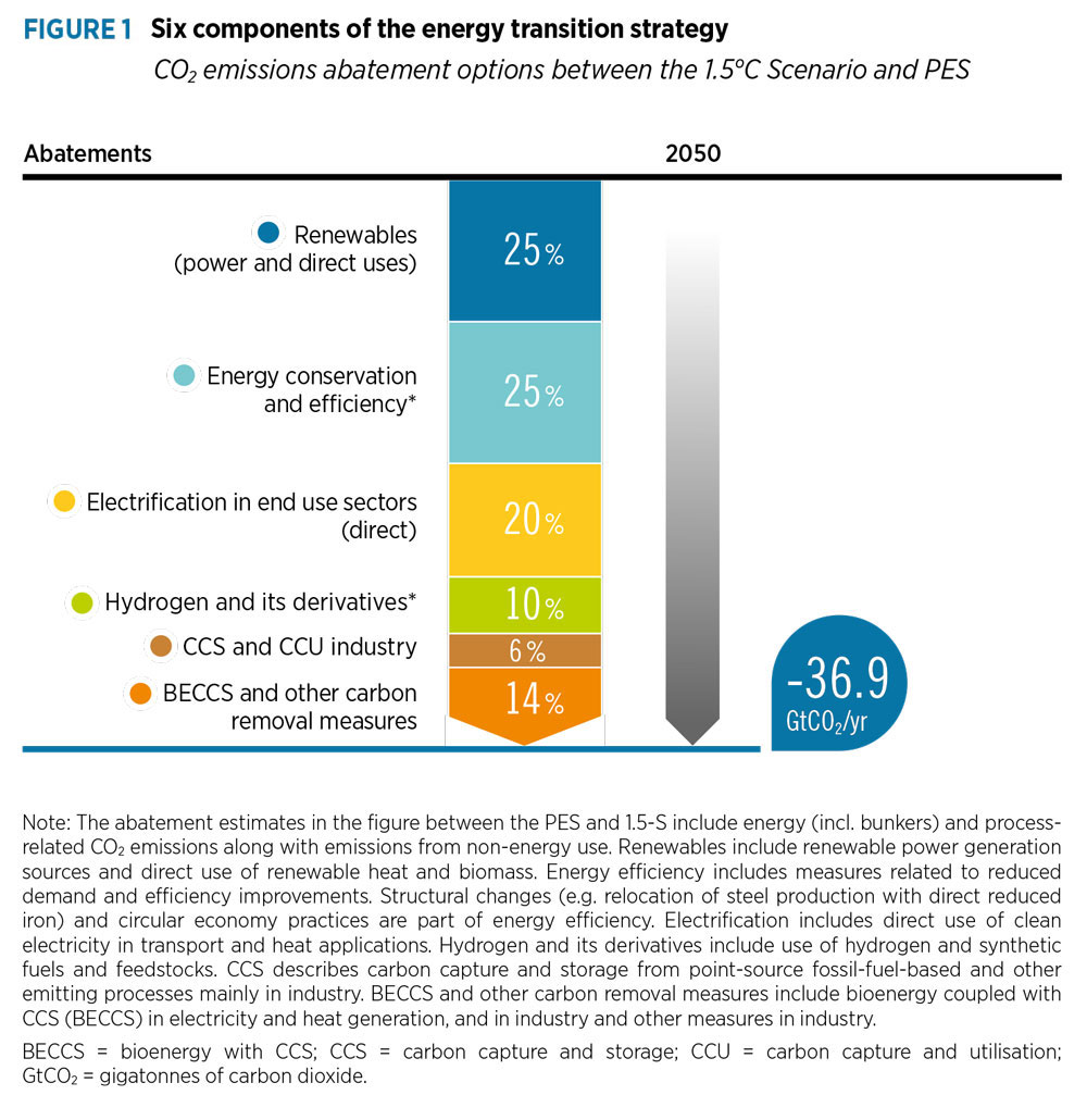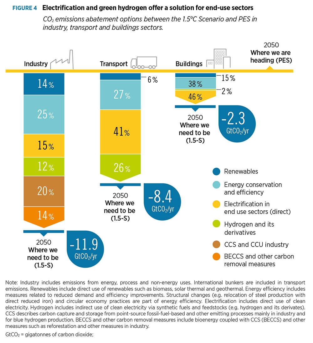 As can be seen in Fig. 1, hydrogen and its derivatives, such as e-ammonia and e-methanol, are a key driver for the abatement of CO2 emissions in 2050, accounting for a tenth of needed reductions in 1.5-S compared with PES. This is significantly less than energy conservation and efficiency improvements, renewables for power and direct uses, and electrification of end-use sectors—but almost twice as much as carbon capture, utilisation and storage.