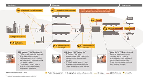 Hydrogen logistics, including patterns of physical gas flows and available storage depots, are complemented by a balancing regime for hydrogen, which allows participants to specify contractual terms that minimise volumetric risks for hydrogen shippers. It is also important for liquid trading to take place at delivery points that exhibit a natural flow of supply and demand and/or are located on the pathway between areas with a structural excess/deficit. The transition to a global hydrogen market is highly dependent on the technological progress regarding hydrogen transportation.