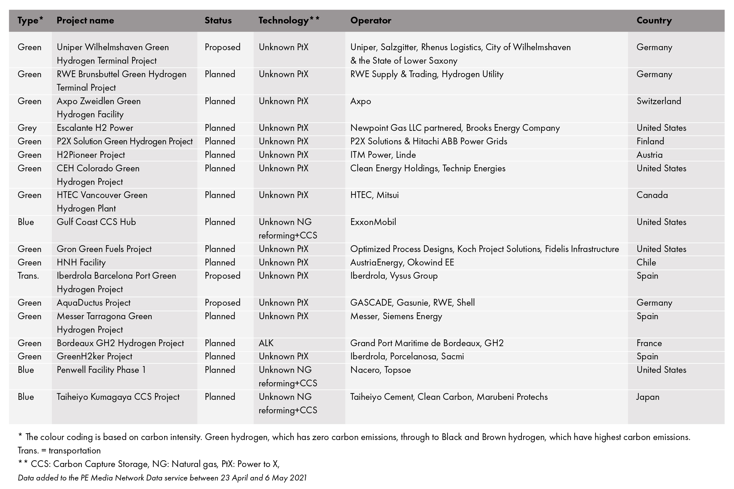 Eighteen new projects were added to our database in the last two weeks and updates provided for 11 existing developments, primarily across green hydrogen, but also blue and grey.