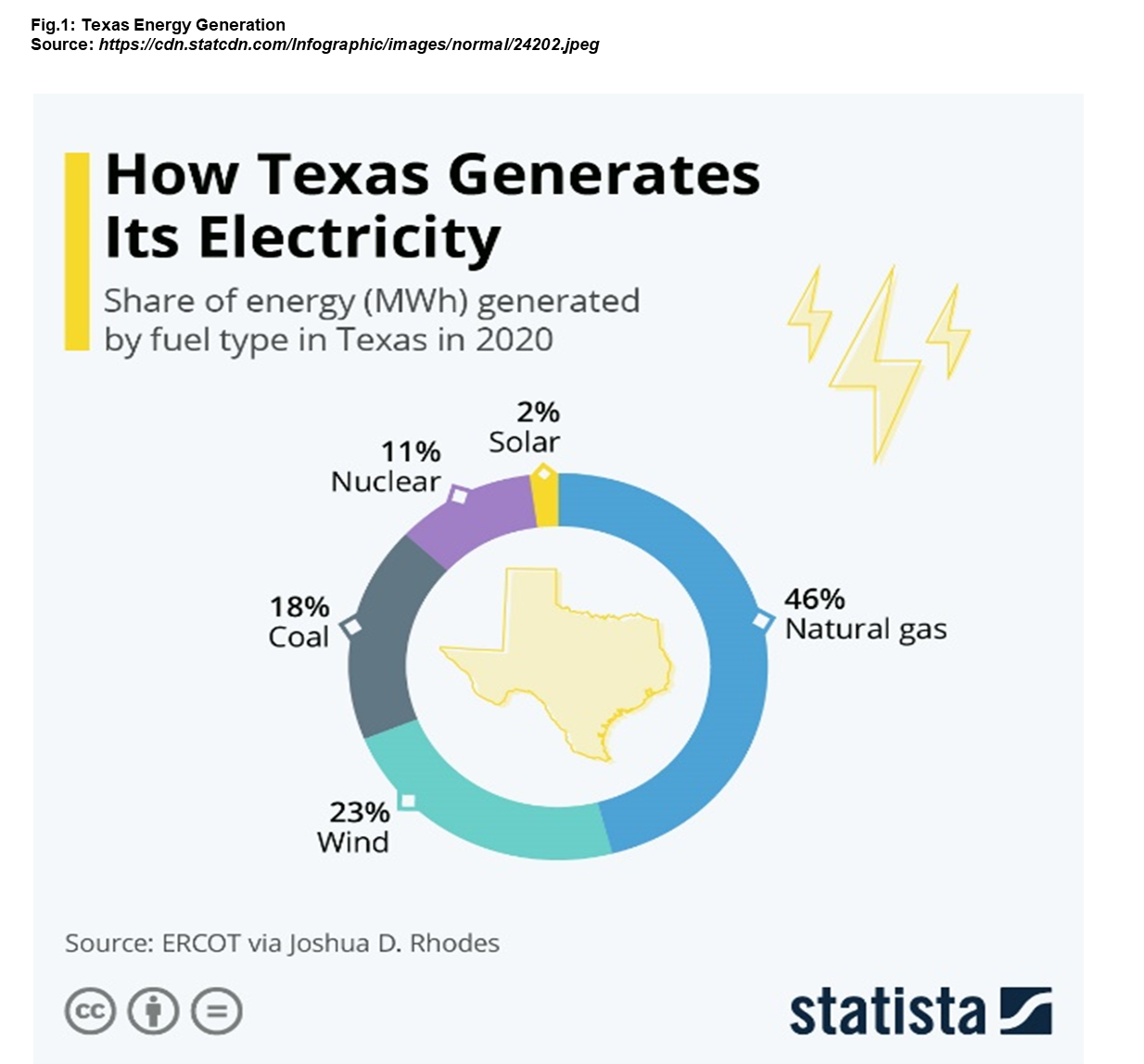 Everything is bigger in Texas, and that includes energy consumption. Texas is powered by a broad mix of fuels, including: natural gas, coal, motor gasoline, distillate fuel oil, jet fuel, hydrocarbon gas liquids, residual fuel, nuclear electric power, hydroelectric power, biomass and renewables. In terms of energy production, as the largest energy-producing state in the United States, Texas leads the nation in crude oil, wind and natural gas production. Although Texas does generate electricity using a diverse mix of sources, in 2020, the Electric Reliability Council of Texas (ERCOT) recorded that the majority of electricity generation in Texas was still driven by hydrocarbons (natural gas and coal) (see Fig. 1).
