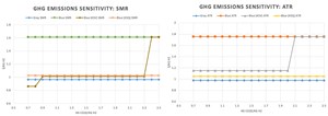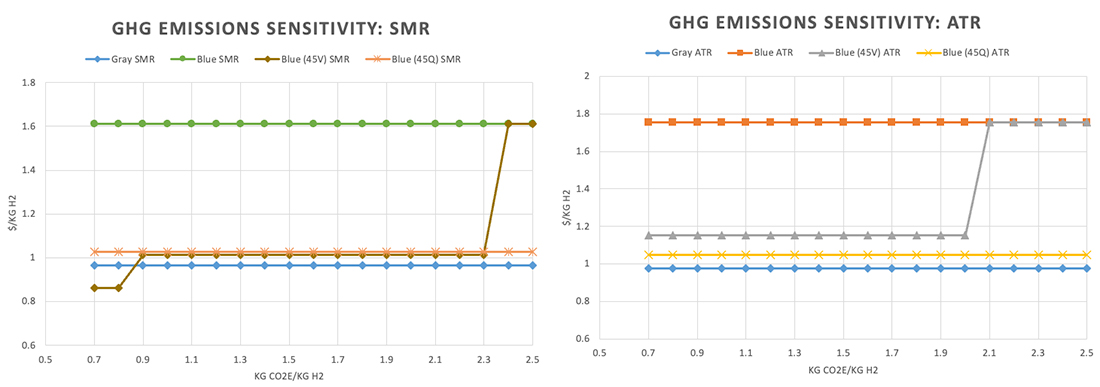 The last analysis performed was the GHG sensitivity analysis. While the model assumes GHG emissions (excluding CO₂) to range between 0.8 kg CO₂e/kg H₂ and 1.05 kg CO₂e/kg H₂ depending on the technology, it is still valuable to understand how eligibility for the 45V tax credit could change if GHG emissions were higher. These emissions are generally difficult to estimate and are often underestimated. Because of this, it is important to consider what those values could look like in the future as estimation technologies improve. For context on how easily GHG values can increase, the CO₂ equivalency of CH4 is 28 kg CO₂e per kg CH₄.11 This means that only 0.036 kg of CH4 emissions would raise the GHG total by 1 kg CO₂e. The results for this analysis are shown in FIG. 5.
