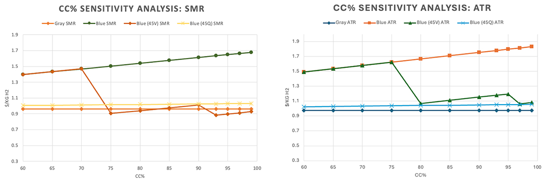 Next, the carbon capture percentage analysis was done to understand how eligibility for the tax credits changes based on the carbon capture rate. Similar to the CCS cost analysis, the focus in this section is on SMR and ATR. The results are shown in FIG. 4.