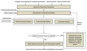 Methodology. The methodology used in this work is illustrated in FIG. 1. First, relevant data were collected on the five options for H2 production and the various specifications for the feedstocks and market. Additionally, a thorough study was conducted on the principal components for federal regulations vis-à-vis the incentives associated with the carbon footprint for H2 production. Performance data were used to create models for each technology. These models were run for a set of base conditions and then assessed through a number of what-if scenarios by altering the input and performance data within plausible ranges. The results were documented in the form of economic, technical and environmental metrics.