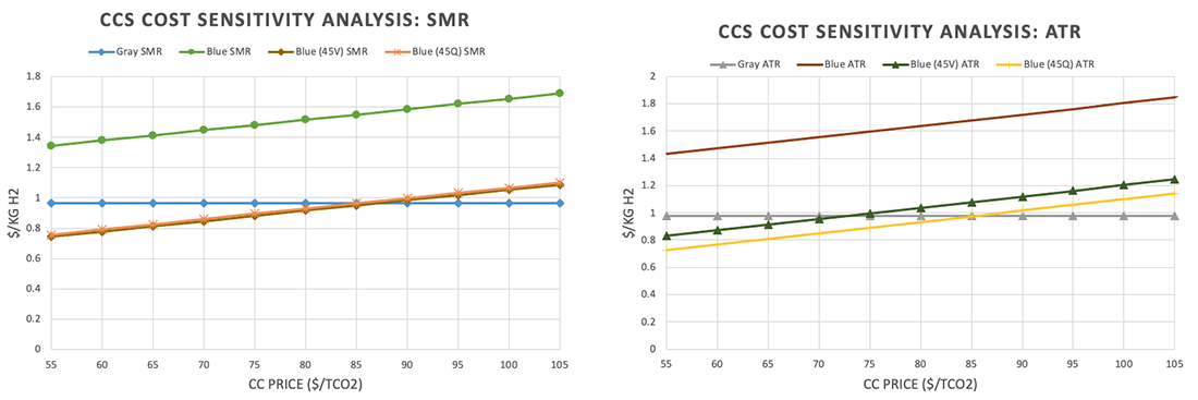 The results for ATR with the 45Q incentive are very similar to those of SMR. When the CCS cost remains below $85/t of CO₂, the tax credit fully offsets the cost. However, because ATR produces more emissions than SMR, it does not benefit as much from the 45V tax credit. If 45V is selected, the CCS cost would need to stay below $75/t of CO₂ to be fully covered. This could also change depending on the carbon capture percentage, as that affects eligibility for the credit. This will be explored further in the next section.