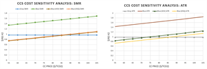 The price range studied for the CCS cost sensitivity analysis was from $55/t of CO₂ to $105/t of CO₂. This range falls within the values introduced by the Internal Energy Agency (IEA) and the U.S. Congressional Budget Office, which were used for the cost modeling.14,15 The results for this analysis are shown in FIG. 3. For this study, the technologies evaluated were SMR and ATR, as they are the most commonly used in the industry.