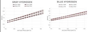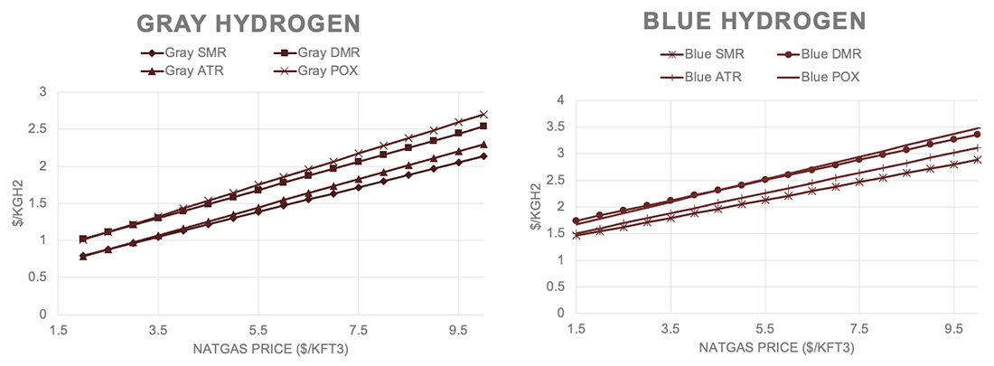 First, a natural gas price analysis was performed, using a range from $1.70 per thousand cubic feet (kft3) to $10/kft³ (all ft3 refer to standard cubic feet). The results highlight how impactful the cost of natural gas is on H2 production. For context, in Texas (U.S.), the cost of natural gas alone ranged from $1.88/kft³–$3.57/kft³ in 2024.13 Looking at the results shown in FIG. 2, for gray H2, this variation translates to a difference of about $0.50/kg of H₂ produced. This becomes especially important when producing millions of kg.