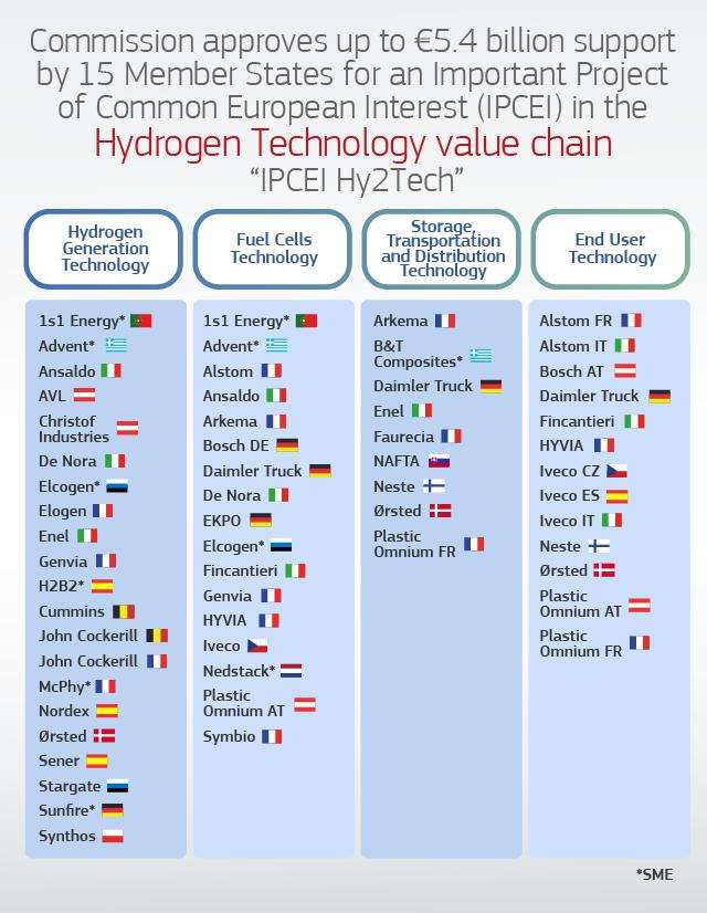 The European Commission approved the IPCEI Hy2Tech-program on H2. This Europe wide partnership industrializes H2 technologies within the European market.